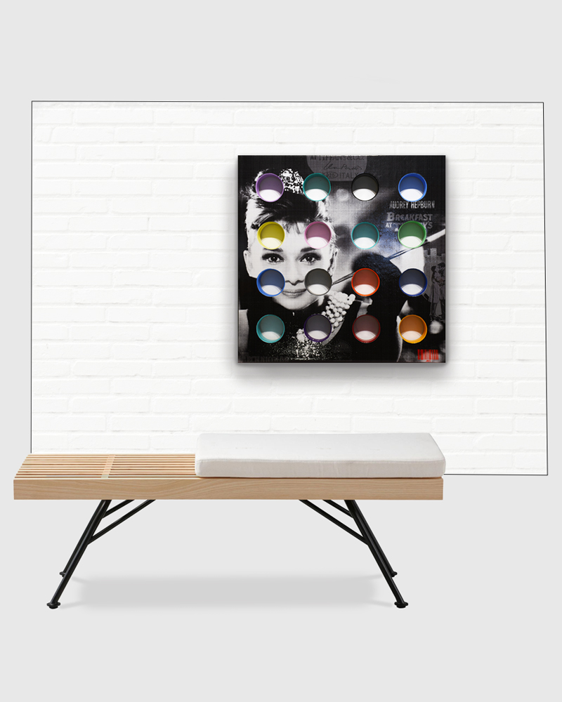 “TIFFANY&CO” 32 by 32 inches, acrylic & mixed media on 3D panel with 16 holes coated in resin (2020)