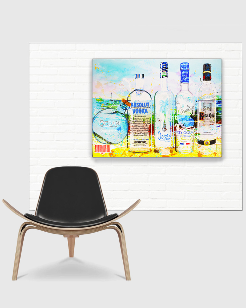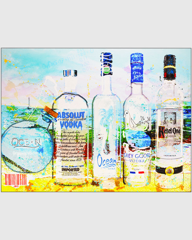 “AN OCEAN OF VODKA” 48 by 36 inches, acrylic - mixed media & GD on canvas mounted to hardpanel coated in resin (2021)